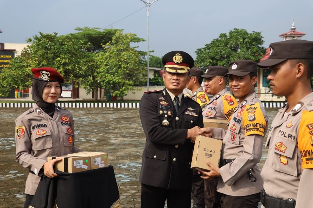 Selesai Upacara, Wakapolres Mesuji menyerahkan Inventaris berupa Handphone kepada perwakilan Bhabinkamtibmas sebanyak 22 Unit dari Polda Lampung, guna menunjang kinerja Personel di lapangan. (***)
