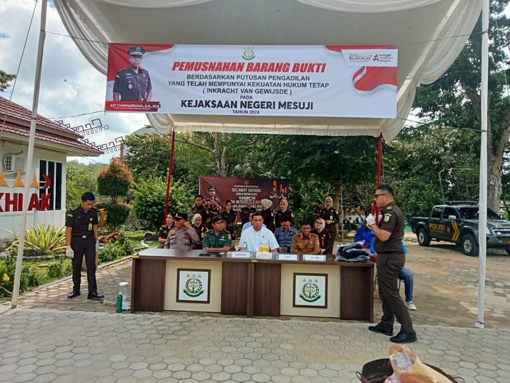 MESUJI —Wahana Lampung. Kejaksaan Negeri Mesuji melakukan kegiatan pemusnahan barang bukti di halaman kantor Kejari, Desa Brabasan, Kecamatan Tanjung Raya, Kabupaten Mesuji, Selasa (04/06/2024).