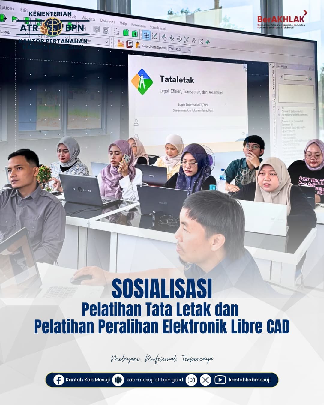 Kegiatan Pelatihan Aplikasi LibreCad ini dipimpin oleh Taufik jabatan pengadministrasi pertanahan Kantor Pertanahan Kabupaten Mesuji yang sebelumnya telah mengikuti pelatihan aplikasi LibreCad dan mendapat pengarahan dari Pusat Data dan Informasi Pertanahan dan Tata Ruang (Pusdatin Kementerian ATR/BPN) di Kantor Wilayah BPN Provinsi Lampung.