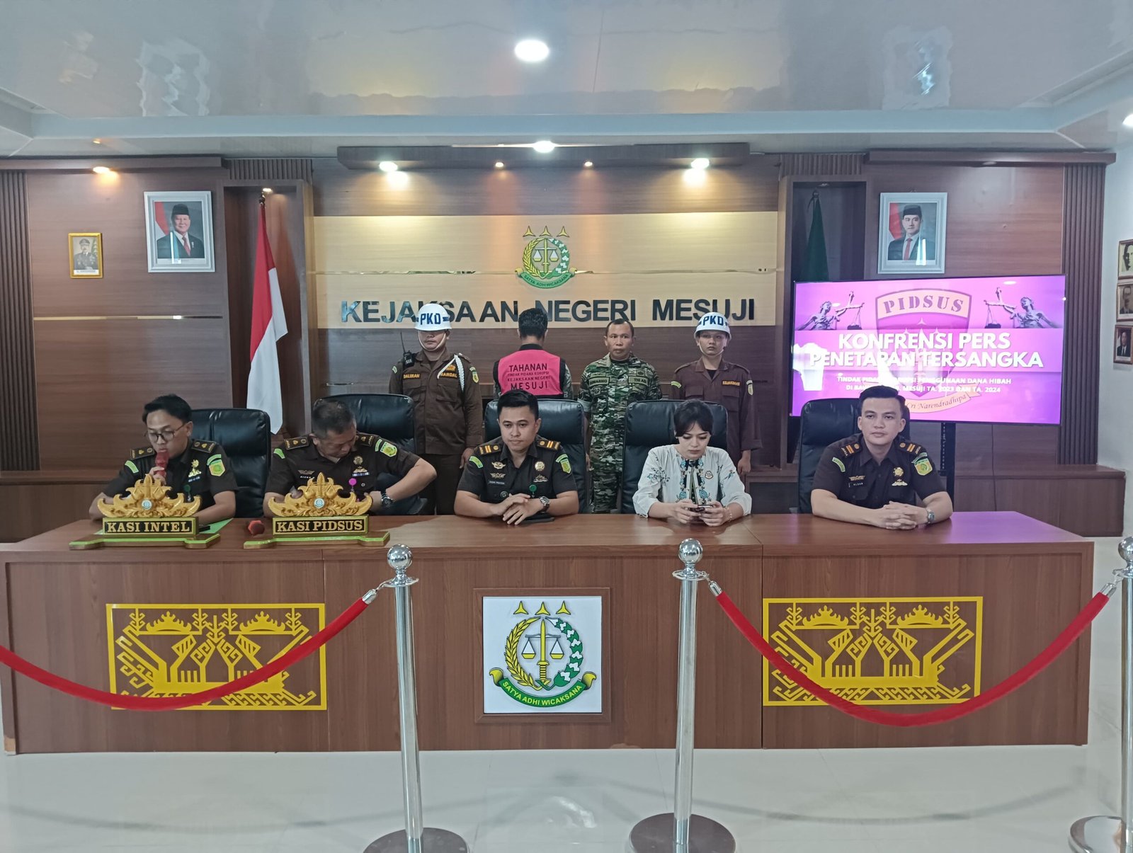 Kasi Pidsus Kejari Mesuji Rizka Nurdiansyah didampingi Kasi Intel Kejari Mesuji Joddie Atma Echi menjelaskan jika pada hari ini Kejaksaan Negeri Mesuji menetapkan DC. Selaku Ketua Bawaslu Mesuji periode 2023 – 2028 dan selaku Pengaju Dana Hibah pemilihan Bupati dan Wakil Bupati tahun 2024 sebagai tersangka.