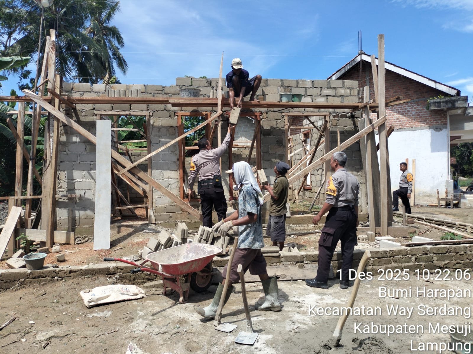 Mesuji – Dalam mewujudkan sinergitas dan keperdulian Polri terhadap Masyarakat Jajaran Polsek Way Serdang melalui Bhabinkamtibmas ikut serta gotong royong bersama warga membangun tempat ibadah yaitu Mushola di Desa Bumi Harapan Kecamatan Way Serdang Kabupaten Mesuji.
