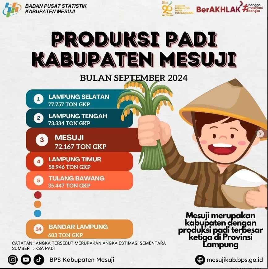 Berdasarkan data Badan Pusat Statistik(BPS) Kabupaten Mesuji per Bulan September 2024, Kabupaten Mesuji menempati Peringkat ke Tiga di Provinsi Lampung penghasil Padi terbayak setelah Lampung Selatan dan Lampung Tengah.(*)